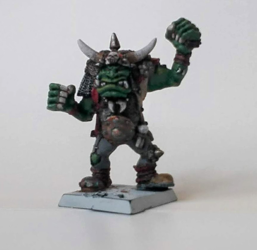 Även om jag tänkte att det var dags att blanda ut orkerna med annat kunde jag inte låta bli att måla en till ork. En oldhammer ork som en gång i tiden var tänkt att bli black orc till ett 3ed ork lag men fick se sig bli ersatt av Varag Ghoul Chewer 5ed modellen.