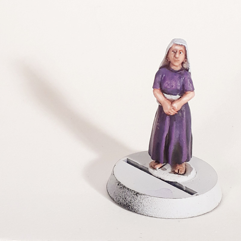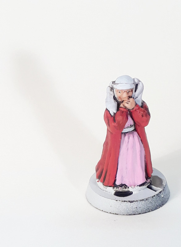 En av Eureka miniatures Italian Renaissance ladies från deras Civilians and Vignettes-linje är denna modell av en orolig dam med en mycket speciell huvudbonad. Bilden blev tyvärr något överexponerad. Har någon några bra tips för figurfotografering?