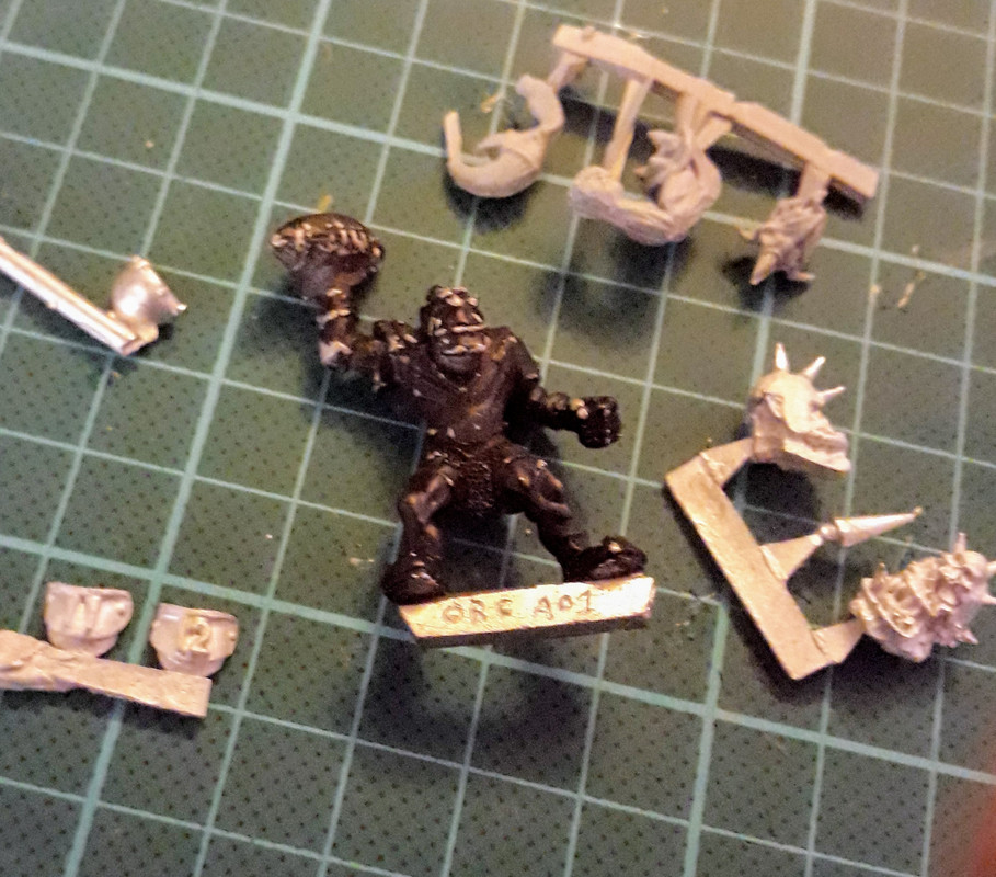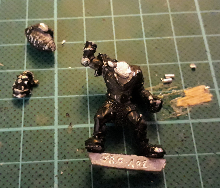 Jag gillar den inte, den håller i en boll (det ska inte orken göra) och har alldeles för lite rustning, saknar exempelvis hjälm. Så jag tog en kniv och skar bort hand och huvud.