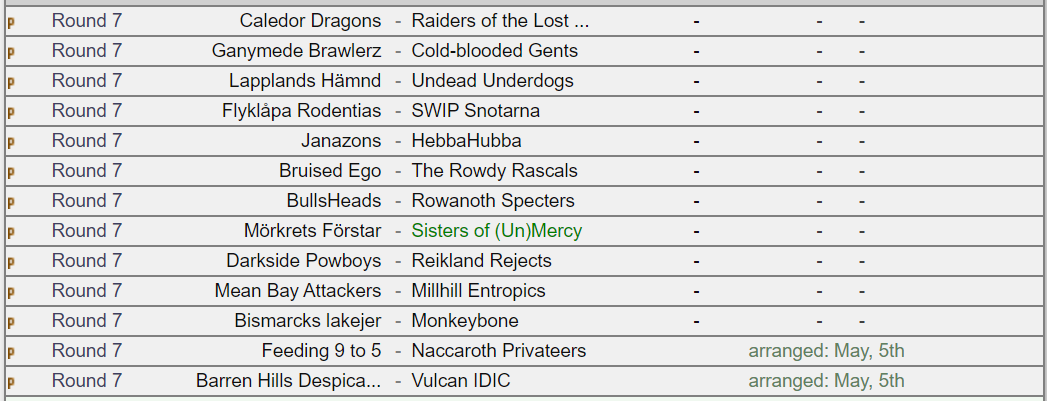 Denna runda MÅSTE vara färdigspelad till den 15 maj, för att spelledningen skall hinna med att både sätta upp Season 34 - Qualifiers samt bjuda in till Season 34 - Wooden Cup.