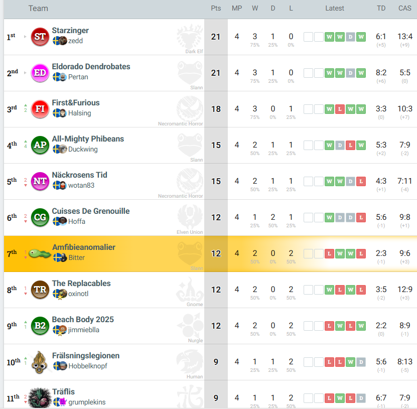 Jag har nått mitt mål med turneringen: Utnyttja vädertabellen! I slutet av första halvlek i match fyra, när vi båda hade en turn kvar (och motståndaren hade en enkel TD framför sig) rullade min Weather mage 10 (+2) med följd av att detta hördes från Alvernas läktare